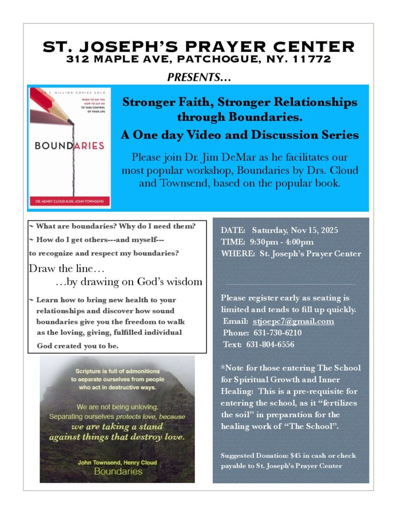 The mission of the St. Joseph Prayer Center is to carry people towards our Lord Jesus, helping to remove the obstacles that would impede a true conversion, using diverse programs, courses and personal spiritual direction and inner healing in accordance with the Magesterium of the Church and in conjunction with the office of New Evangelization of the diocese of Rockville Centre.”